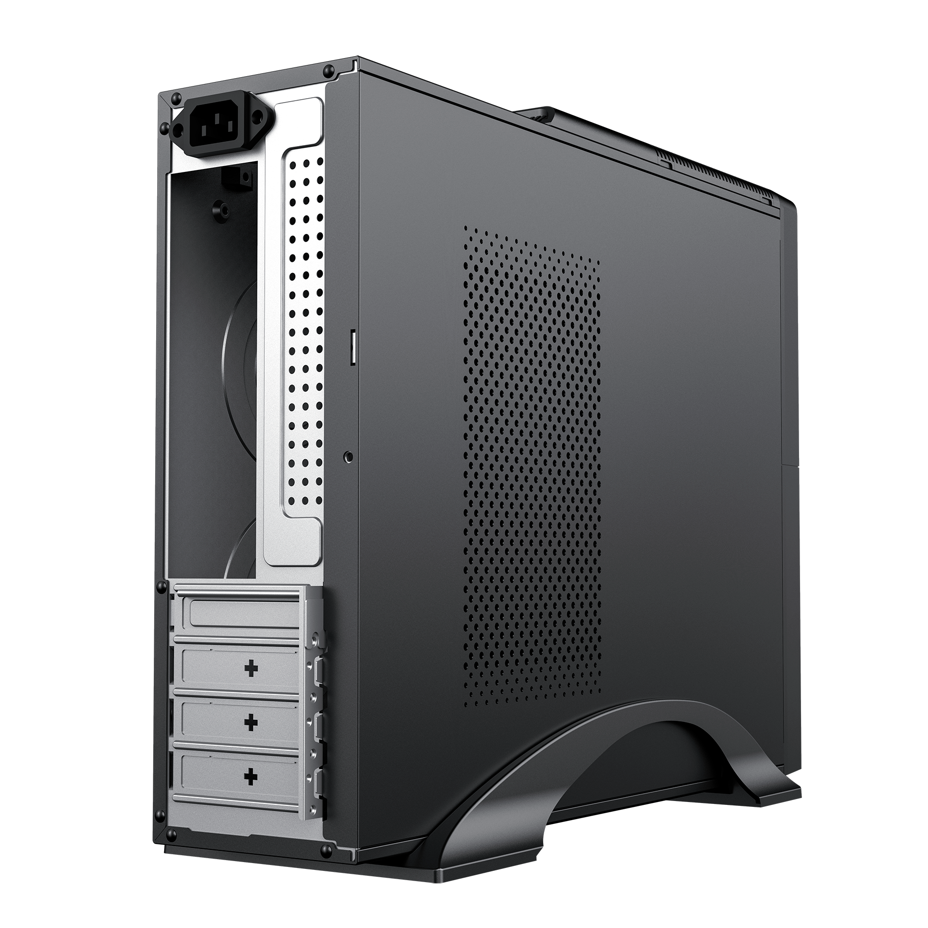 Caja micro ATX con diseño compacto de Phoenix para PC en formato SLIM y con frontal acabado elegante en brillo y una fina linea plateada.