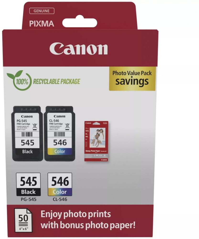 El pack de oferta incluye tintas negra y de color, además de 50 hojas de papel fotográfico satinadoLa tinta Canon original permite imprimir, de media, hasta un 35 % más de impresiones de calidad que los cartuchos de imitaciónLa tinta