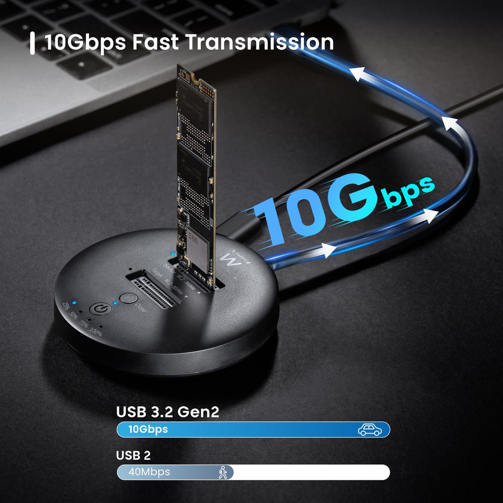 Equipada con dos ranuras NVMe M.2, esta estación permite leer y escribir en ambas unidades de manera simultánea, ofreciendo una gestión eficiente de archivos de gran tamaño. Su diseño optimizado garantiza una transferencia estable y rápida incluso bajo carga intensiva.
