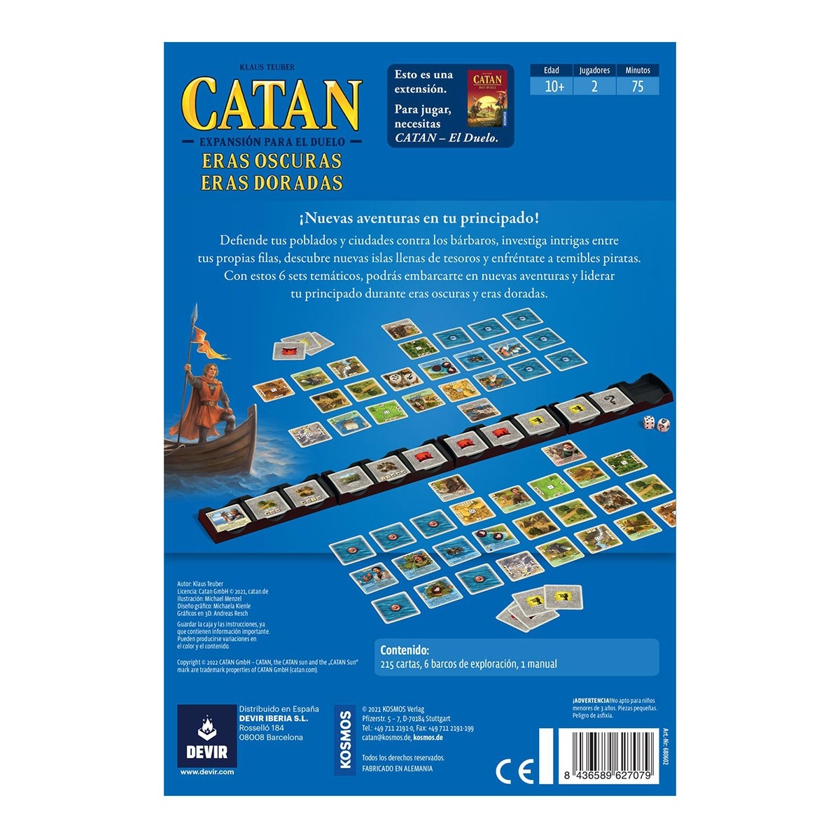 sus varias adaptaciones y versiones) e ilustrado por Michael Menzel, Eras oscuras, eras doradas permite partidas de unos 75 minutos, para dos jugadores, a partir de 10 años. Catan: el duelo es la
