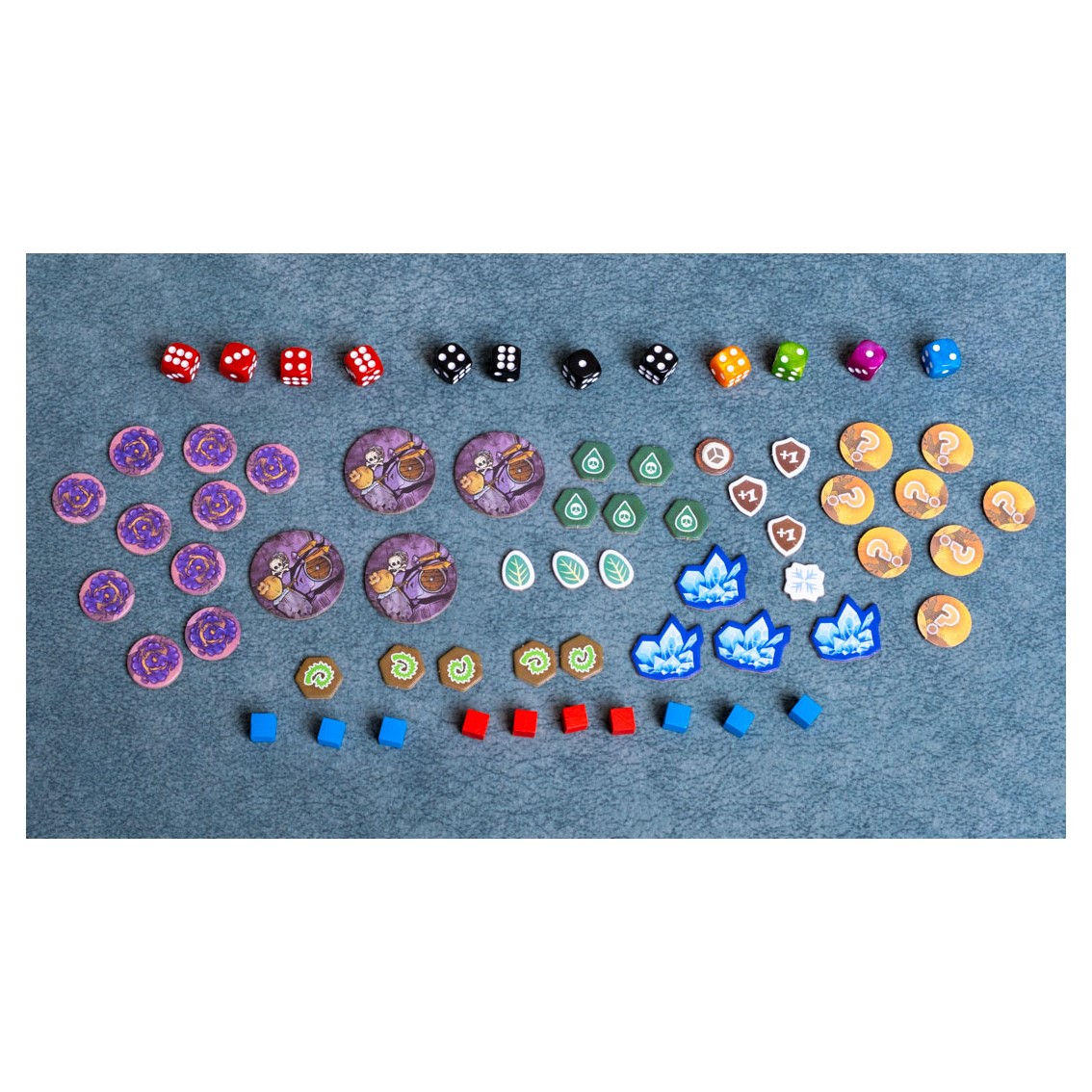 Contenido: 4 tableros personaje, 4 figuras de personaje, 12 dados, 24 losetas de bosque, 65 cartas (63x88mm), 72 fichas, reglamento.