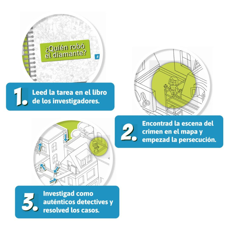 El juego de las imágenes ocultas. En MicroMacro Kids os convertÃs en investigadores. El mapa está repleto de sucesos misteriosos:¿cómo desapareció el hueso de dinosaurio?¿Quién podrá detener al robot furioso antes de que arrase la ciudad?¿Cómo consiguió escapar de la policÃa el ladrón de diamantes?Para resolver estos casos, tendréis que trabajar en equipo. Para eso tendréis que seguir pistas, resolver acertijos y perseguir a los sospechosos. ¡Como lo harÃan unos auténticos detectives!Componentes:Un enorme mapa de la ciudad en formato 75×55 cm.Un libro de los investigadores de 220 páginas con 22 casos.1 libro de reglas.20 fichas de detective.Jugadores 1-4Edad recomendada +6Duración de la partida 15-45 min