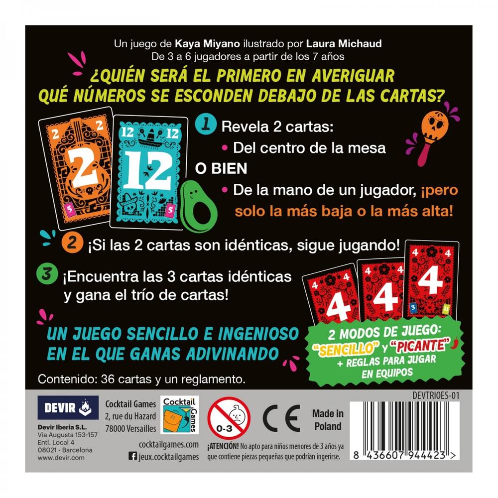 Un, dos, tres ¡Trío! Busca y recuerda las cartas que tienen el resto de los jugadores y las que hay en el centro de la mesa para formar conjuntos de tres cartas iguales antes que lo haga el resto.