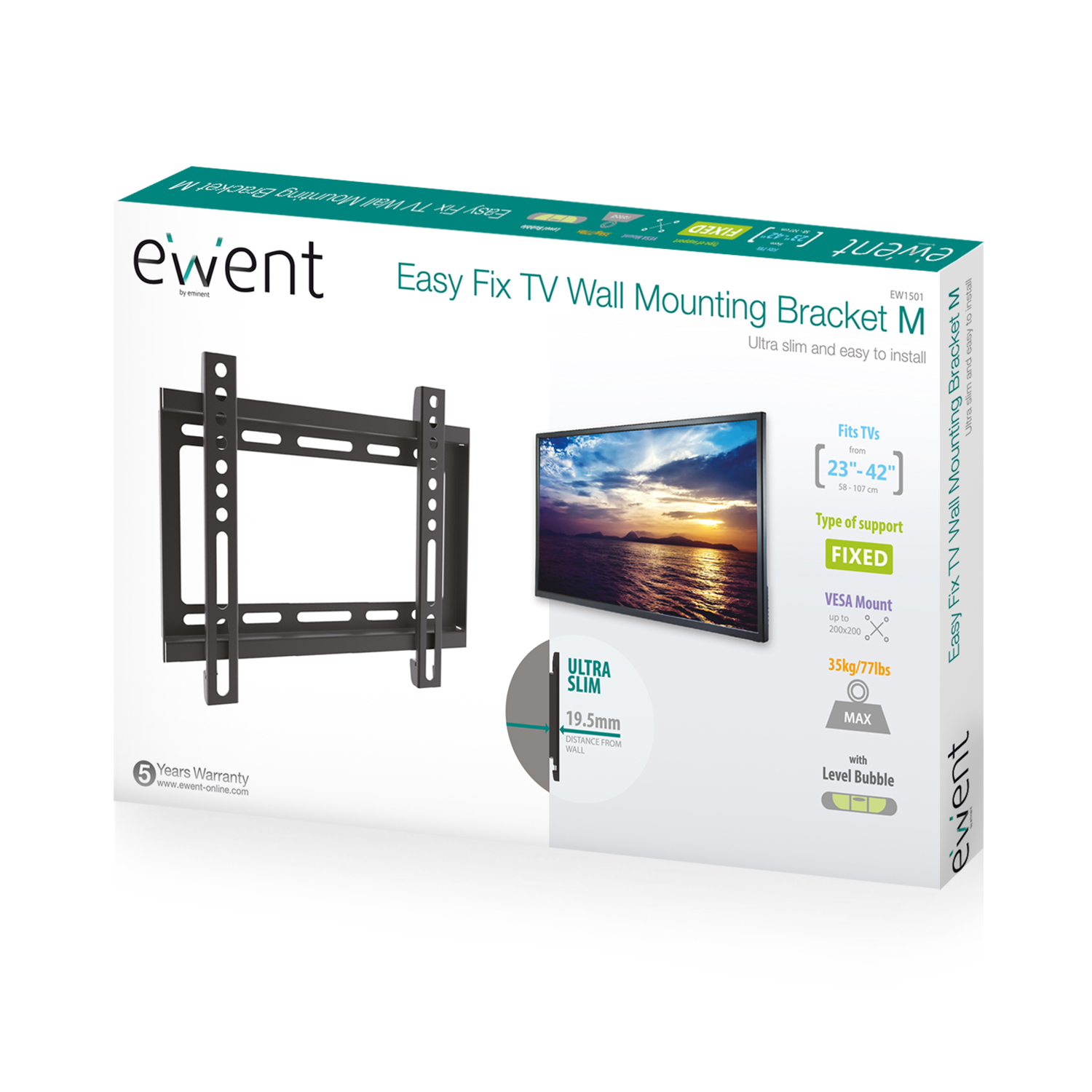 El soporte para pared EW1501 Easy Fix de tamaño medio es la solución ideal para instalar su televisor (con tamaño desde 23 hasta 42 pulgadas y peso máximo de 35 kg) extremadamente cerca de la pared. El soporte tiene un perfil