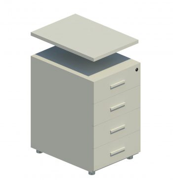 Los cuerpos de las cajoneras se fabrican con panel de partículas aglomeradas de 19mm espesor en techo, suelo, costados y frentes .Y de 10mm para las traseras. Revestido por ambos lados con papel decorativo impregnado en resinas melamínicas. Canteado con PVC de 1mm de espesor y radio 1mm. Todos los bloques llevan guías metálicas provistas de rodillos recubiertos con material plástico para amortiguar ruidos y con freno para evitar golpes debidos a cierres bruscos del cajón. El sistema de cierre es centralizado. Las cajoneras están provistas con llave abisagrada para evitar roturas + llave de repuesto.
