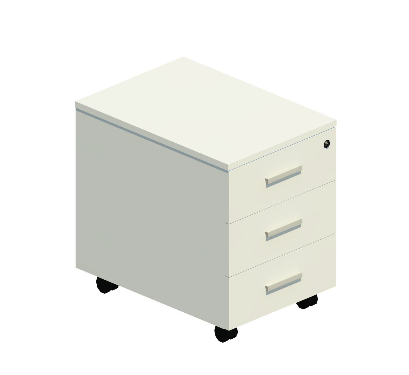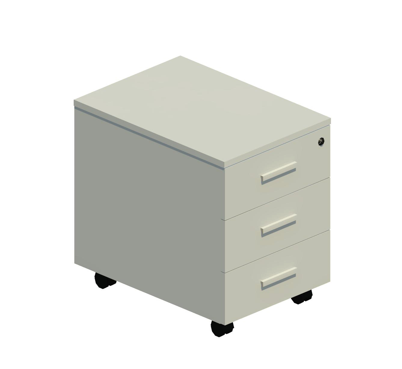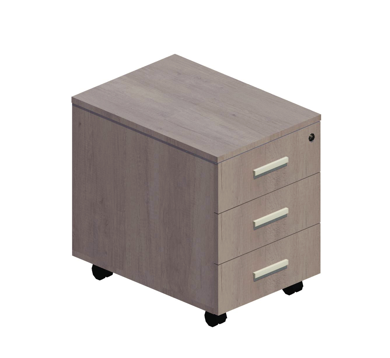 Los cuerpos de las cajoneras se fabrican con panel de partículas aglomeradas de 19mm espesor en techo, suelo, costados y frentes .Y de 10mm para las traseras. Revestido por ambos lados con papel decorativo impregnado en resinas melamínicas. Canteado con PVC de 1mm de espesor y radio 1mm. En combinaciones de 3 cajones o de 1 cajón + 1 archivo para los bloques rodantes. Todos los bloques llevan guías metálicas provistas de rodillos recubiertos con material plástico para amortiguar ruidos y con freno para evitar golpes debidos a cierres bruscos del cajón. El sistema de cierre es centralizado para todos los cajones sin antivuelco para los bloques de 3 cajones y con 5ª rueda antivuelco en los bloques de 1 cajón + 1 archivo. En los bloques altura mesa no es necesario el sistema antivuelco. Ambos tipos de cajoneras están provistas con llave abisagrada para evitar roturas + llave de repuesto. Medidas 57,5×42,2x57x5cm.