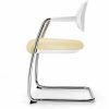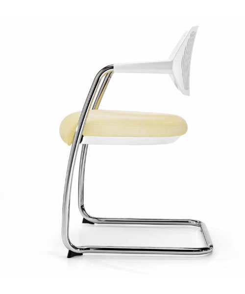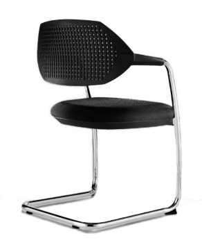 Sillón confidente, respaldo medio, con acolchado en espuma moldeada en asiento tapizado. El respaldo, enteramente fabricado en polipropileno, está elegantemente perforado, pudiendo ser de color negro o blanco. Estructura de patín, fabricada en tubo de acero redondo de 25×2 mm., pintado en gris. Brazos fijos, integrados con el respaldo y la estructura, fabricados en polipropileno de color negro.