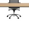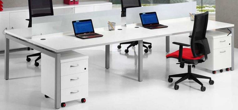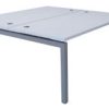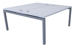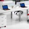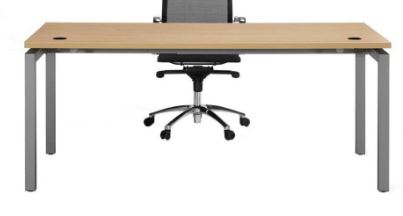 Tapa de mesa fabricada en bilaminado de 30mm. Laterales de mesa de metal en forma de porteria con reguladores de alguna. Viga telescópica de metal bajo mesa, para canalizar cables. Canto redondeado en 2mm. 2 pasacables de serie.