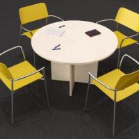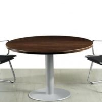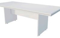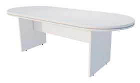 Tablero de mesa de 30mm más embellecedor gris de 10mm y molduras de 19mm.Terminaciones Gris, Haya, Wengué, Blanco y Roble. Mesa ovalada con base con forma de H. Medidas: 240x100x74, 200x90x74.