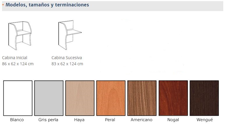 Precio variable según opciones disponibles. Módulos iniciales o individuales y se prologan con módulos sucesivos. El resultado es un completo sistema de telecabinas. Cada linea a montar se compone de un módulo inicial y tantas extensiones, o módulos sucesivos, como puestos necesite.Tableros de 30mm en laterales y mesa, traseras fabricadas en 19 mm. Cantos redondeados en 2mm. 4 niveles de suelo.